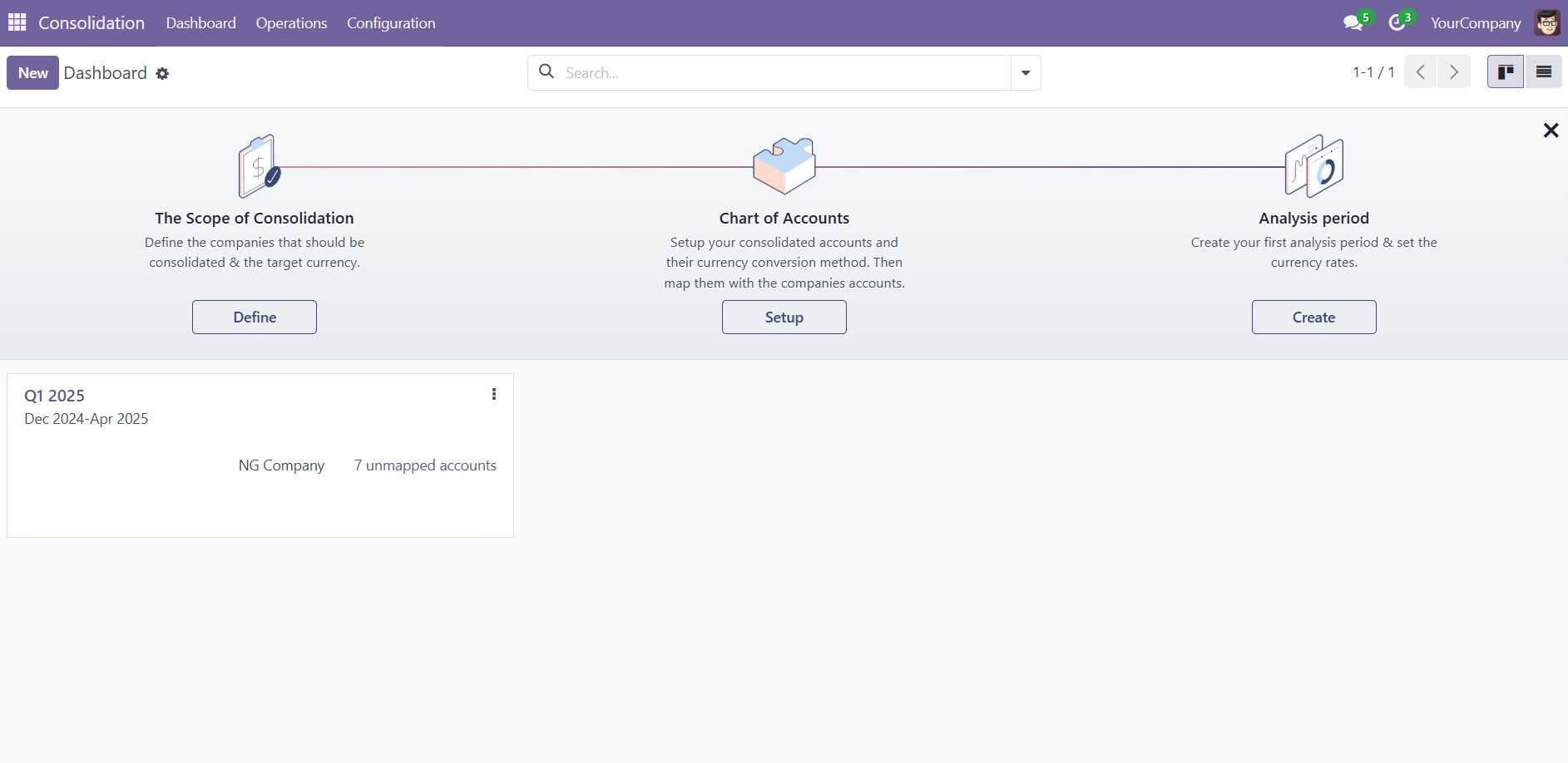 We will go over every feature available in the Odoo Consolidation module. When you click on the Odoo Community Consolidation module from your main dashboard, Odoo Community will take you to the Consolidation dashboard of the module, as seen in the image below.