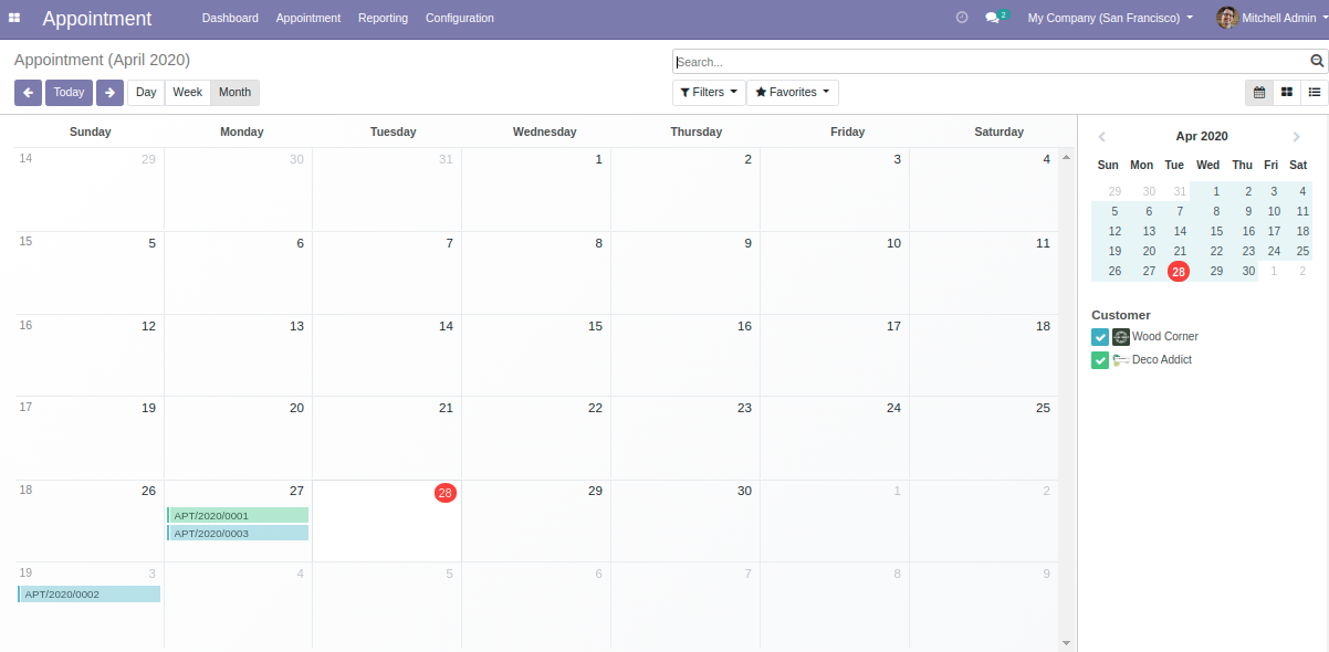 Odoo Appointment Management System installs a versatile appointment manager in your Odoo. This module enables you to create customer's appointments, assign receiving member(s) to each meeting, send reminder emails to customers, and much more. It also lets you track and manage each appointment/meeting in Odoo.